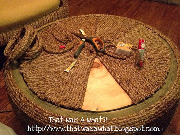 3) Started at outer edge of tire, and glued rope to tire one line at a time, rolling tire as I went.